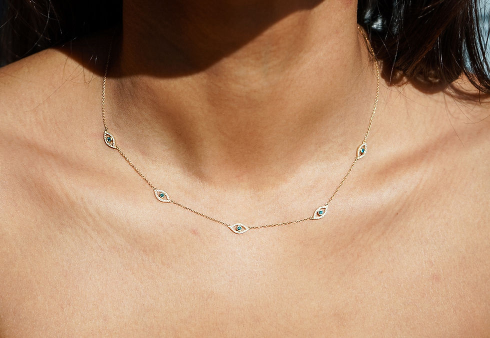 14K Diamond +Turquoise +Sapphire Evil Eye Necklace