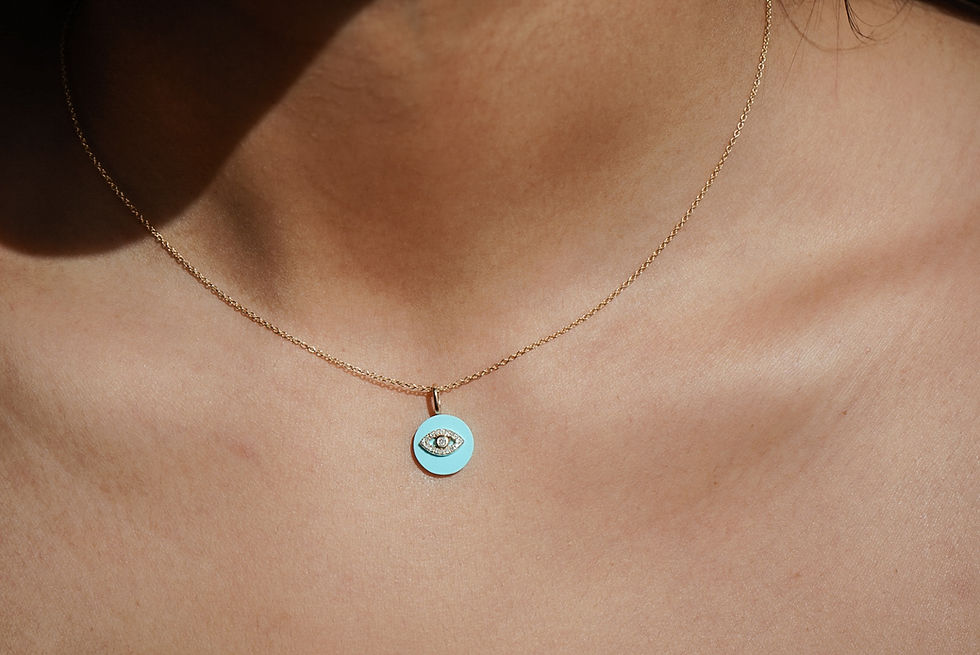 14K Diamond +Turquoise Disc Evil Eye Necklace